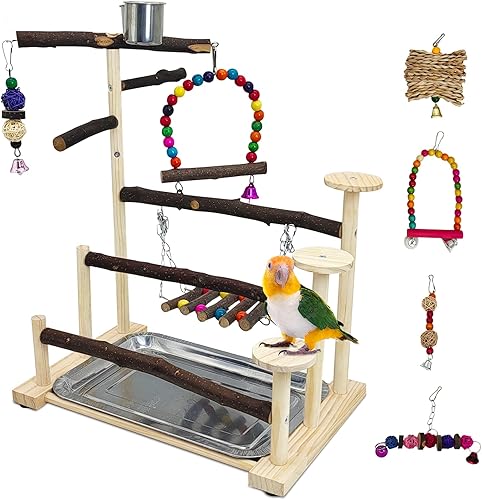 PINVNBY Bird Playground Parrot Playstand Play Gym Cockatiel Wood Bird Toys Birds Cage Accessories Playpen Ladder with Feeder Cups Hanging Swing Toys for Parakeet Conure Lovebird Cockatiel