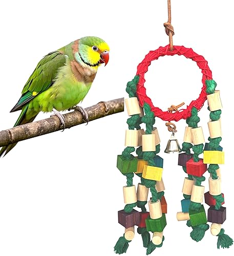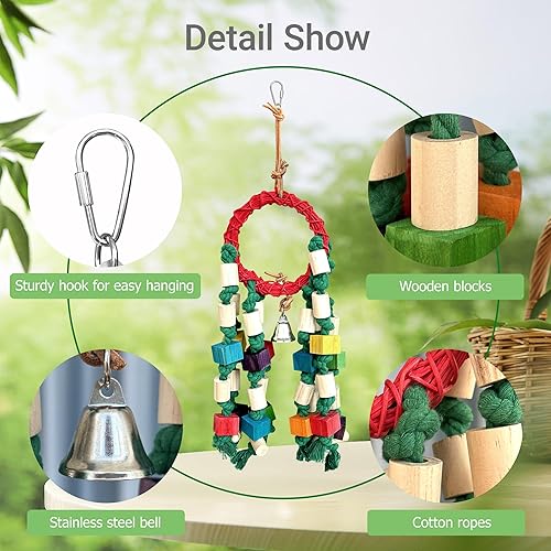 LUCKITTY 18in Natural Parrot Toys for Small & Medium Birds- Chew Toys with Rattan Ring, Cotton Rope & Wood Blocks, Colorful Eco Cage Accessories for Budgies, Cockatiels, Lovebirds, Conures