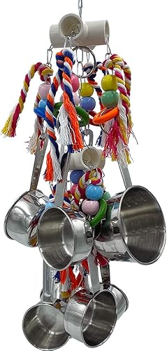 New Upgraded Metallic Pots and Multicolored Ring Toys, Pullable 8 Stainless Steel Cups and 8 Wooden Ring Toys for Large and Extra Large Parrot Amazons Macaws African Greys Cockatoos Eclectus