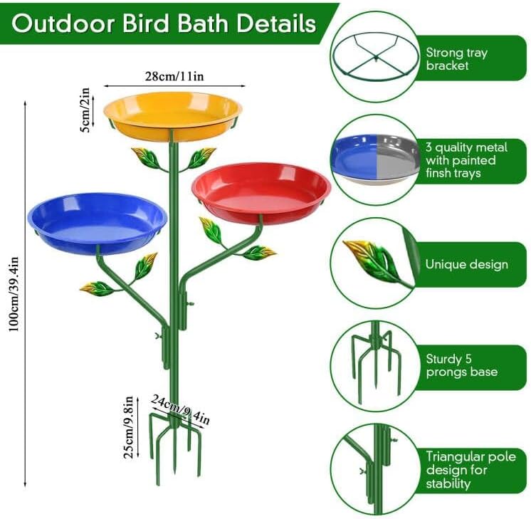 Metal Bird Bath for Outside, 39.4" H Birdbaths for Outdoors, 2 in 1 Free Standing Birdbath with 5-Prong Metal Stake, 3 Tier Large Bird Feeder Bowl for Garden Yard Lawn Decor