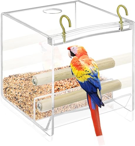4.7x5.1x5.1in No Mess Bird Feeder for Cage, Indoor Acrylic Bird Cage Feeder with Hooks, ParakeetCage Accessories for SmallBird Parrots Canary Parakeet Budgerigar Crested