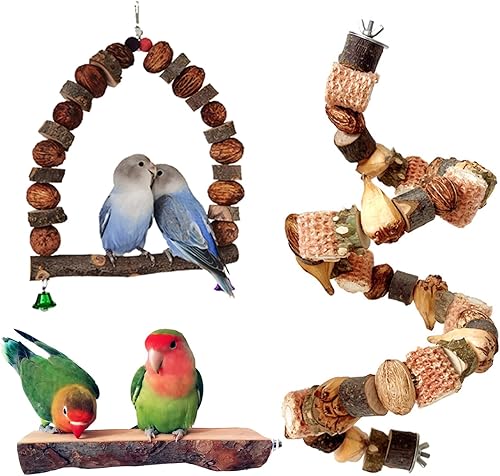 Bird Chew Toys 3PCS Parakeet Natural Wood Perch Stand Bird Cage Accessies for Parrot,Conure,Cockatie,Parrotlet, Lovebird,Budgie(Nature Color)