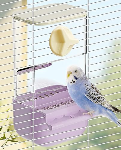 BNOSDM No Mess Bird Cage Feeders Automatic Bird Feeder Parrot Cage Accessories Transparent Seed Food Container with Perch for Finches, Parakeets, Budgies, Lovebirds, Cockatoos, Canaries(Purple)