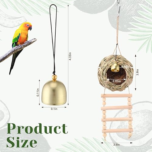Hanging Bird Nest for Cage with Ladder Bell Natural Coir Fiber, Grass Hand Woven Hummingbird Finch House for Outside Breeding Nest Parakeet Bed for Budgie Canary Parrot Patio Lawn Garden