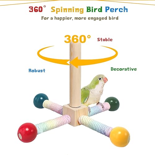 Spinning Perch Bird Toys for Cage, Interactive Rotating Parrot Toy, 360° Wooden Perch Stand for Cockatiel Parakeet Budgies, Bird Cage Accessories Enrichment Toy for Small & Medium Parrot