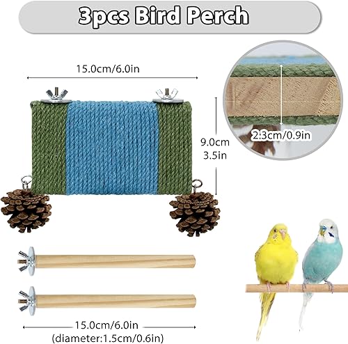 3Pcs Wooden Bird Perches for Cage, Bird Platform with Chewable Pinecones & Hemp Rope-Wrapped for Claw Trimming, Thick Sturdy Parrot Perch Stick for Secure Grip, Natural Perches for Cockatiel Conure