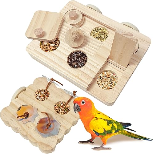 2PCS Wooden Bird Foraging Puzzle Toys Interactive Parakeet Enrichment Foraging Toy for CageBird Slow Feeder Parrot Chewing Toy for Pets, Bird Perches Stand for Sun Conure and Small Sized Birds