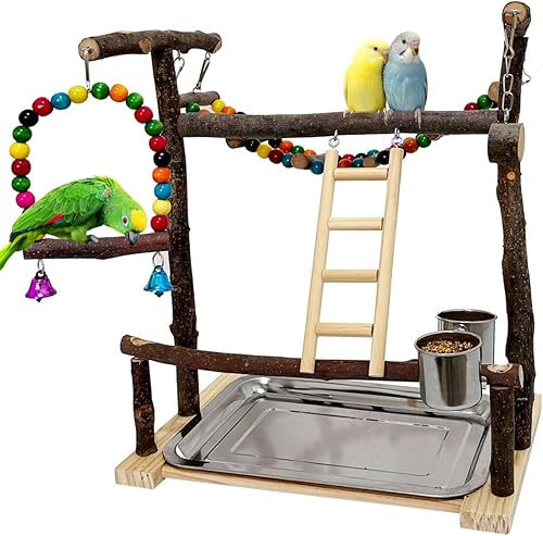 Wooden Bird Play Stand, Natural Parrot Playground Parakeet Perch Stand Cockatiel Perches Platform Swing Climbing Ladder with Removable Tray and 2 Stainless Steel Cups for Budgies Conures