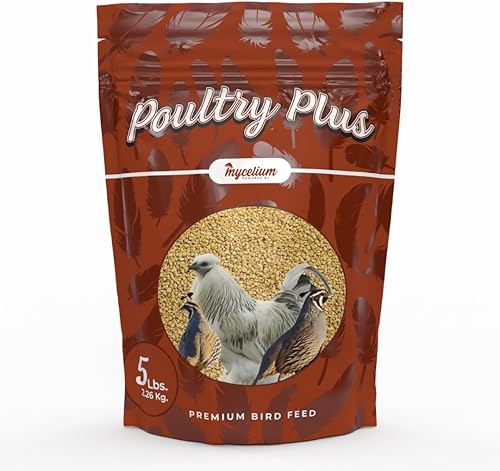 Mycelium Poultry Plus | Premium Chicken, Duck & Turkey Food with Oats, Corn, Wheat, Milo, Safflower & Peas | Supports Egg Production & Feather Health | Made in USA | 5 lb Bag