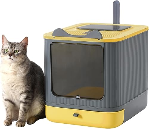 Upgraded Fully Enclosed Cat Litter Box with Lid, Covered Cat Box Enclosure, Anti-Splashing Easy to Clean Kitty Litter Boxes with Drawer, 3 Modes can Use from Kitten to Adult(Yellow&Grey)