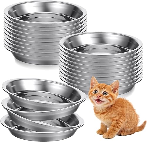 24 Pcs Stainless Steel Cat Bowls, Shallow Pet Food Dishes Metal Cat Feeding Plates Replacement Relief Whisker Fatigue Food Water Bowl for Cats Kitten Puppy Dog(5.5 Inch Diameter)