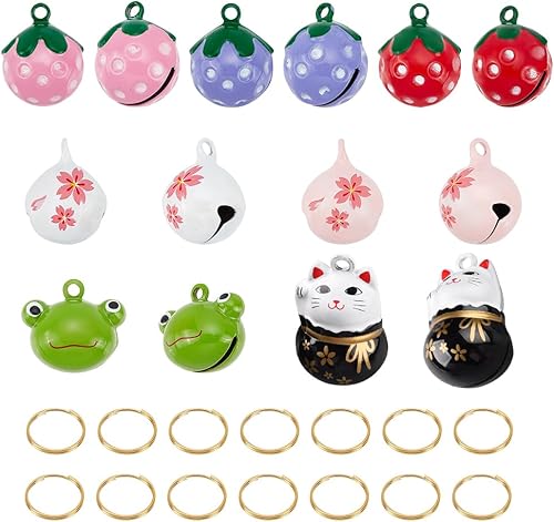 CHGCRAFT 14Pcs 7 Styles Pet Collar Bells Brass Cherry Panda Frog Strawberry Charm Cat Collar Bell Pet Pendant Accessories with Stainless Steel Double Loops Jump Rings for Potty Training