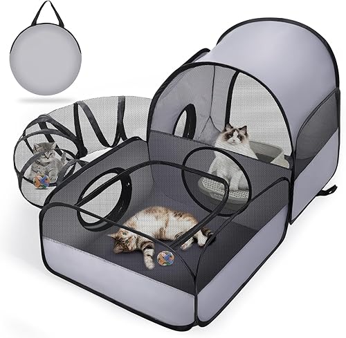 Portable Cat Playpen with Surround Tunnel, 2-Linked-Enclosed Areas, Ideal Cat Tent Outdoor or Cat Playpen for Indoor Cats Enclosed.Breathable Mesh Design for Indoor & Outdoor Use