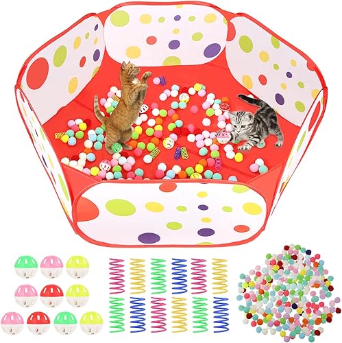 Cat Ball Pit Include 200 Pom Pom Balls 10 Jingle Balls and 12 PCS Cat Spring Toy for Indoor Bored Self Play Enrichment Toy for Indoor Cats Interactive Fun and Exercise