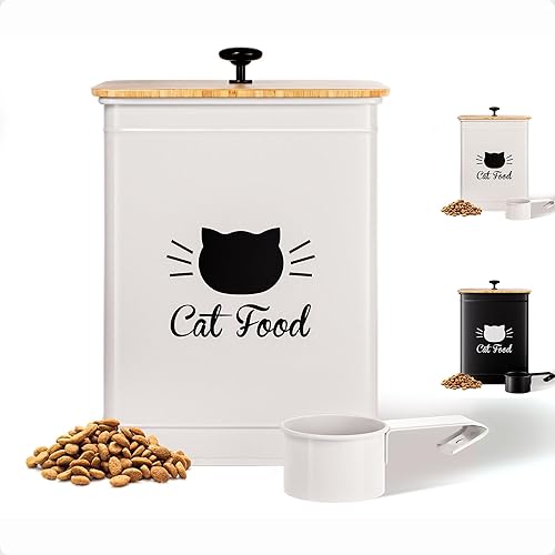 Cat Food Storage Container with Scoop - 5-7 lb (25 Cup) Capacity Metal Cat Food Container with Airtight Bamboo Lid and Metal Scoop - Airtight Pet Food Storage Containers 5 lb - 7 lb Kibble Container