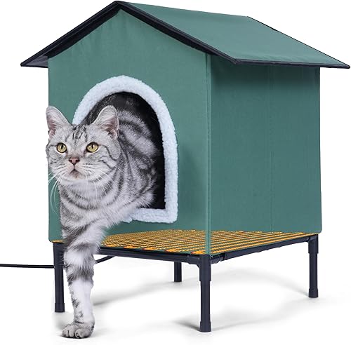 Heated Cat House for Indoor/Outdoor Use, Elevated/Insulated Feral Cat House, Heated Cat Bed with Pets Heating Pad, Warm House for Outside Stray Cats (Green,Medium)