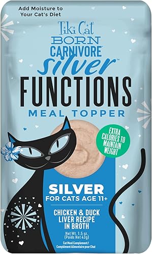 Tiki Cat Born Carnivore Functions Silver, Chicken & Duck Liver Recipe in Broth, High Protein Formulated for Senior Cat Diets, Mousse Cat Food Topper for Older Cats 11+, 1.5 oz. Pouch (12 Count)