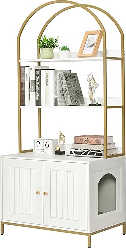 Homhedy Cat Litter Box Enclosure, Litter Box Furniture Hidden with 2-Tier Storage Shelves, Wooden Cat Washroom Furniture with Metal Frame, Modern Style, Black and Gold