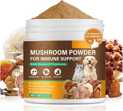 Mushroom Supplement Powder for Dogs & Cats, 11 Beneficial Mushroom Complex for Immune Support, Cellular Protection, Heart & Brain Health Lion's Mane, Reishi & Turkey Tail, Bacon Flavor - 120g
