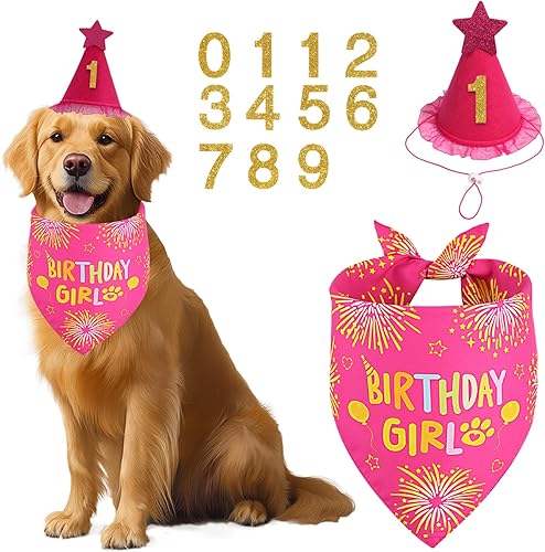 Dog Birthday Decorations Rose Pink, Dog Birthday Party Supplies with Hat Bandana Numbers for Large Medium Girl Pets Puppy