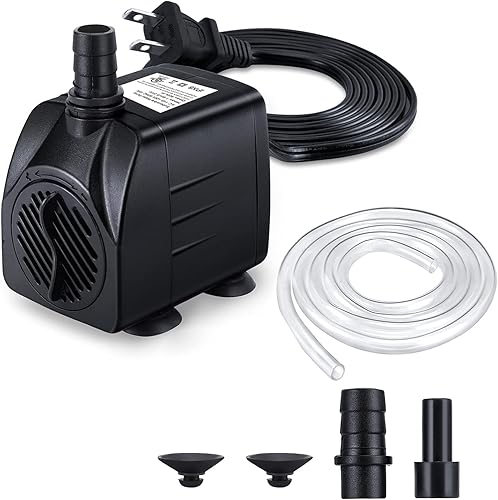 Fountain Pump, 160GPH(10W 600L/H) Submersible Water Pump, Durable Outdoor Fountain Water Pump with 4.9ft Tubing (ID x 1/3-Inch), 3 Nozzles for Aquarium, Pond, Fish Tank, Water Fountain Pump