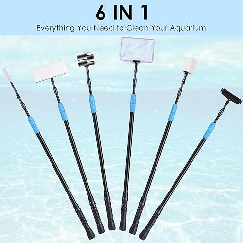 AquaMiracle 6 in 1 Aquarium Cleaning Tool Kit Fish Tank Cleaning Kit for 20-160 Gallon Tank with Telescopic Long Handle, Algae Scraper, Scrubber Pads, Tube Cleaner, Fish net, Gravel Rake