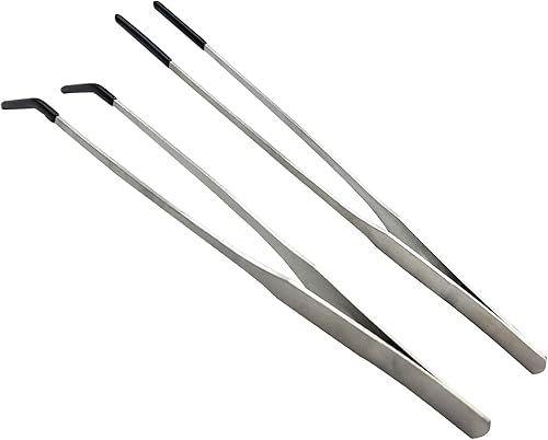 Stainless Steel Straight and Curved Tweezers Aquarium Tweezers with Rubber Tips Long Handle Reptile Feeding Tongs for Fish Tank Aquatic Plants, 2pcs, 10.6 Inch, Silver