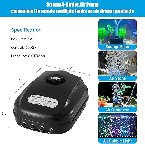 AQUANEAT Aquarium Air Pump 300GPH, for up to 200 Gallon Fish Tank, Powerful Hydroponic Aerator Pump, Adjustable Oxygen Bubbler