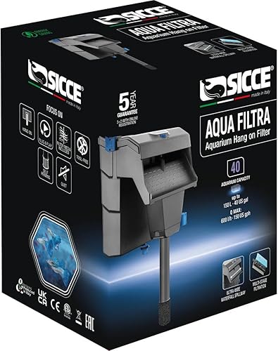Sicce Aqua Filtra 40 Hang On Back Aquarium Fish Tank Power Filter Up to 40 Gallon Aquariums - Quiet 3-Stage HOB for Freshwater & Saltwater