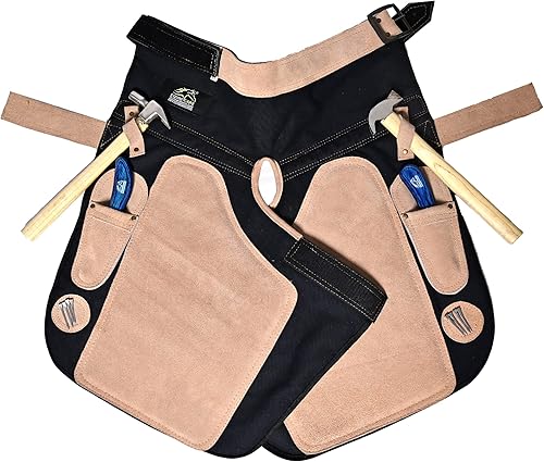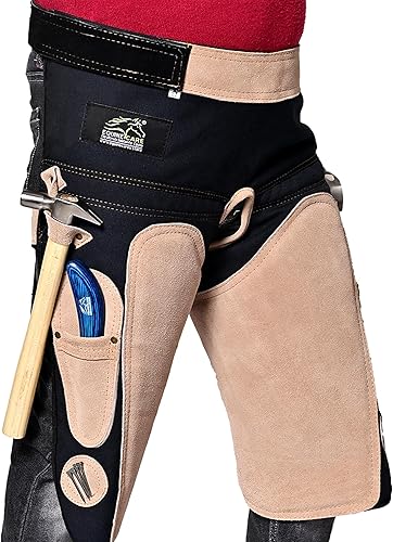 Equine Care Farrier Apron Chaps for Men 25" Cowhide Suede Leather & Canvas, Adjustable 28"-52" Waist, 2 Hammer Loops, Hoof Knife Pockets & Nail Magnets, Air Mesh, Farrier Tools for Hoof Trimming.