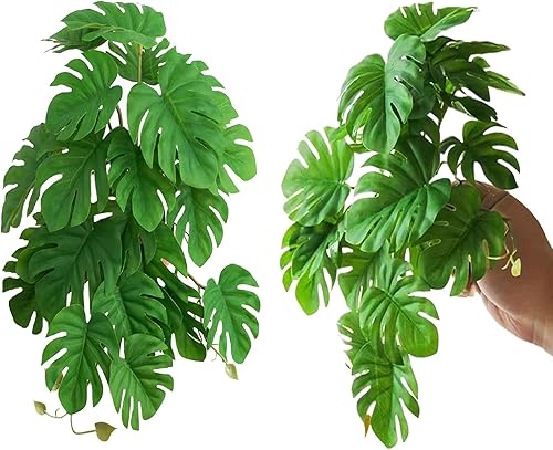Reptile Plants for Terrarium, Artificial Hanging Plastic Plants with Suction Cups,Amphibian Tank Habitat Decor fit for Bearded Dragons Chameleon Lizards Snake 2Pack (Fake Monstera (A))