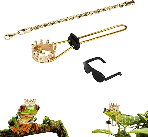 Lizard Crown Necklace Set Cool Sunglasses Costumes for Bearded Dragon Leopard Gecko Iguana Hedgehog Hamster Guinea Pig Pet Snake Frog Reptiles Amphibians Apparel Photo Gifts Props (Gold)