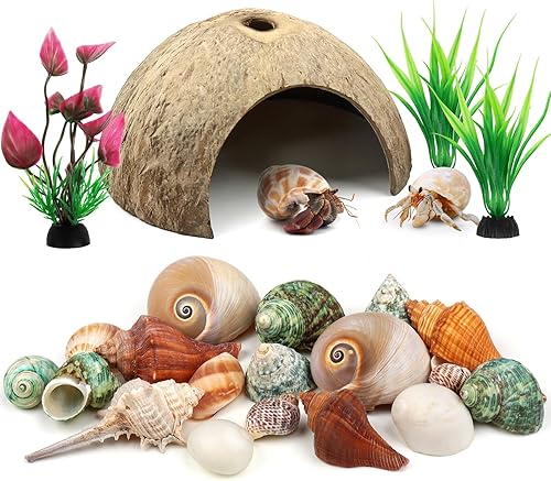 Hermit Crab Sea Shells Natural Coconut Shell Hut Artificial Plants, Hermit Crab Supplies Seashells for House Hermit Crab Tank Hide Reptile Hideouts - 22 PCS, 1275-QU
