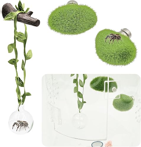Jumping Spider Enclosure Accessories, 1 Glass Ball Habitat Hide with Green Rope and Artificial Tree Branch 2 Green Platform, Jumping Spider Enclosure Decor