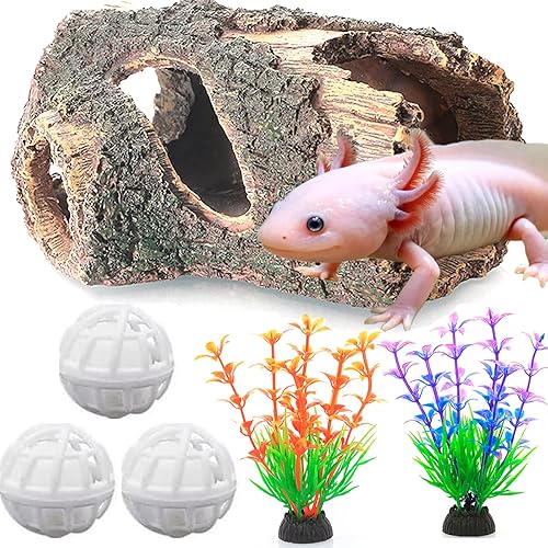 6 pcs Axolotl Hideout Set with Cave Fake Water Plants Filter Balls Reptile Hides Aquarium Terrarium Corner Hideaway Underground Curve Tortoise Turtle Hideout Lizard Fish Tank Decor Accessories