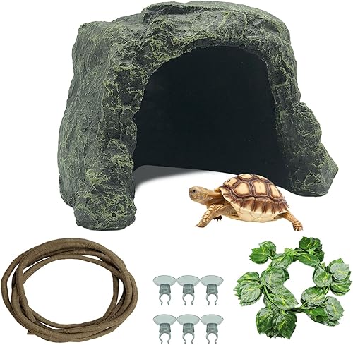 Tfwadmx Reptile Hideout, Tortoise Shelter, Tortoise Hide Cave, Turtles Hideout with Bendable Vines Leaves, Rock Cave Habitat Hidden for Turtles Tortoise Bearded Dragons Lizards Geckos Snakes