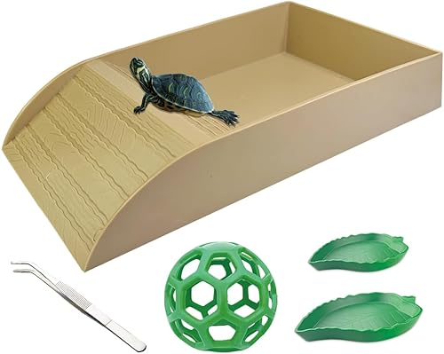 5 Pcs Tortoise Water Dish Set,Gray Tortoise Water Dish with Ramp and Turtle Water Bowl,Turtle Feeder Ball,Scrub Brush,Amphibian Reptile Water Bowl Turtles Pool Can Be Used for Turtles,Lizards