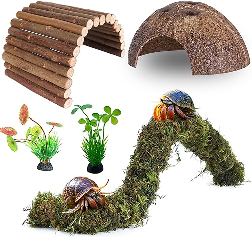 Hermit Crab Accessories, Hermit Crab Climbing Toys Bendable Bridge Coconut Shell Hideout Hut Plants for Crested Gecko Chameleon Reptile Amphibians Supplies