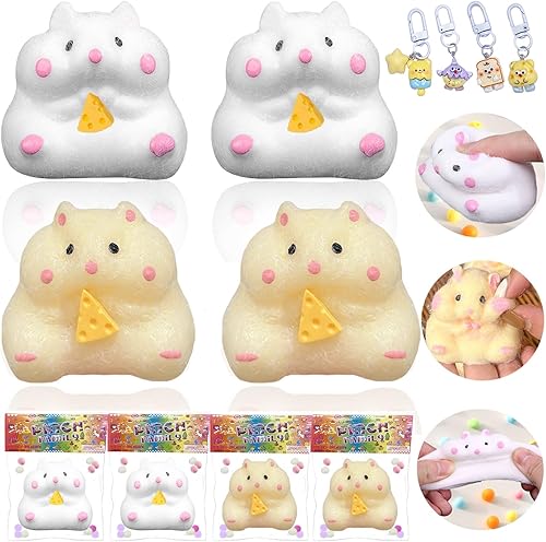 4PCS Taba Squishy Hamster with Cheese Squeeze and 4PCS Keychain,Hamster Squishy,Stress Relief Squishies for Adults,Small Hamster Decor for Home Office Desktop