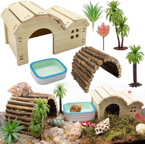 Hermit Crab Kit Hideout Water Pool Tank Decorative Accessories with Palm Tree Decorations Enrichment Toy for Turtles Lizard Frog Gecko Chameleons