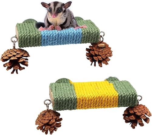 Sugar Glider Cage Accessories, 2 Pack Cage Platform with Rope and Pine Cone Decor, Standing & Climbing Toy, Relax Platform for Sugar Glider, Squirrel, Rat and Other Small Animals
