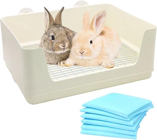 Fhiny Large Rabbit Litter Box for Cage, Plastic Guinea Pig Ltter Pan with 6 PCS Disposable Pee Pads Potty Trainer Corner Toilet Box for Bunny Guinea Pigs Ferrets Chinchillas Small Animals (White)