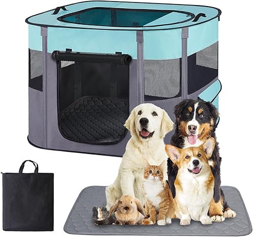 Portable Dog Cat Playpen with Waterproof Pad,Collapsible Pet Puppy Kitten Crate,Foldable Small Animals Kennel Cage for Indoor Outdoor Travel Camping,Water-Resistant Breathable Shade Cover (Pink M)