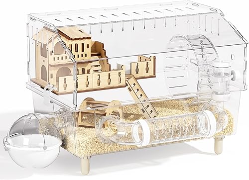 9-in-1 Acrylic Hamster Cage, Clear Dwarf Hamster Pet Cage with 360° View, 2-Tier Top-Open Syrian Hamster Cages with All Accessories, Easy-Clean Tray and Ventilated Design for Small Pets (Transparent)