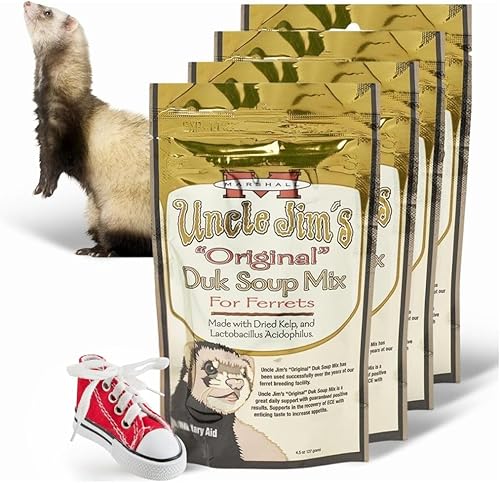 Marshall Uncle Jim’s DUK Soup Mix for Ferrets – 4.5 oz Each – Digestive Support, Recovery & Vitality Aid – Includes 2 Squeaky Toys for Enrichment & Fun – (Pack of 4)