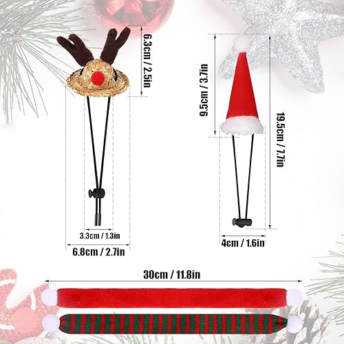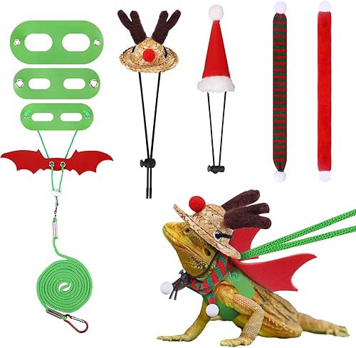 Bearded Dragon Christmas Costume - 7pcs Clothes Accessories Set with Scarf, Santa Hat, Leash & Harness for Small Lizards - Green & Red