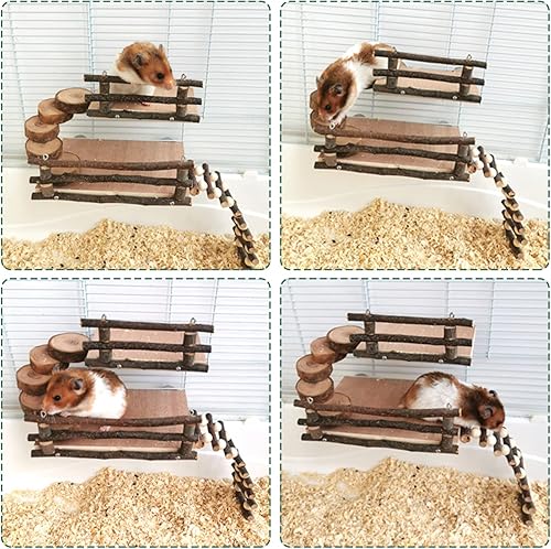 Fhiny Hamster Climbing Toys, 2 Layer Wooden Activity Platform with Bridge Hanging Playground Cage Accessories Hamster Wood Chewing Toys for Dwarf Hamsters Gerbils Small Pets