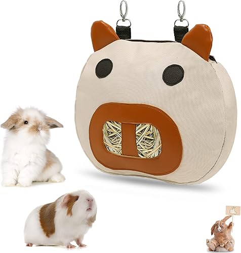 Rabbit Hay Feeder Bag, Hay Feeder for Guinea Pig Timothy Hay Feeder Dispenser Storage with 2 Hanging Hooks for Bunny Small Animal Cage Mess Free (Brown)
