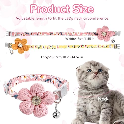 2pcs Pink Cat Collar with Bell, Breakaway Girl Kitten Collar, Adjustable Girl Cat Collar with Knitted Flowers & Safety Buckle for Cats and Puppy Dog (Pink, Yellow)