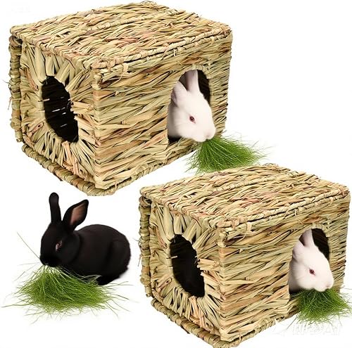 Grass House for Rabbits,Sangle Sopffy,Hand Woven Bunny Grass House,Natural Grass Hideaway for Bunny Guinea Pig Chinchilla Ferret Hamster Squirrel with Rabbit Chew Toys (2 Pack, 11.8 * 7.8 * 7.8 inch)